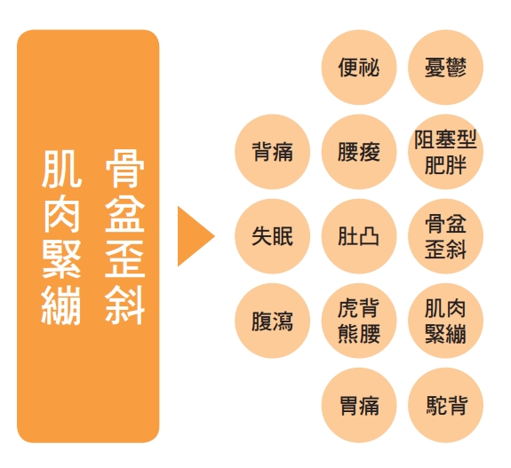 身體痠痛與肌肉僵硬、阻塞的原因大多是身體歪斜所引起,骨盆是脊椎的基座,姿勢不良容易導致骨盆歪斜引起全身骨骼也跟著歪。